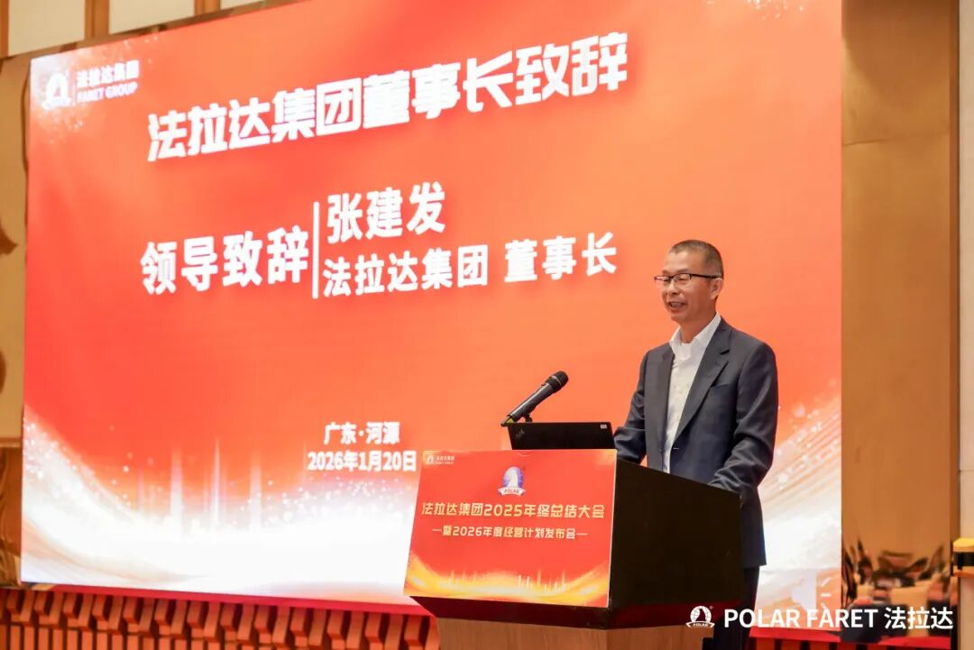 法拉达集团董事长张建发先生在大会中,代表集团向全体员工的辛勤付出与坚定奋斗致以诚挚感谢。他表示,面对过去一年复杂多变的外部环境与行业挑战,全体员工展现出卓越的韧性与拼搏精神,共同攻坚克难,顺利达成年度经营目标,这份成绩来之不易,凝聚着每一位法拉达人的智慧与汗水。
