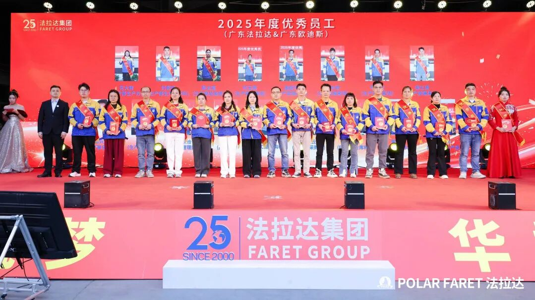 法拉达集团过去一年所斩获的每一份辉煌,都离不开全体法拉达人的辛勤付出与无私奉献。在 2025 年广东、天津两地新春晚会上,集团同步举办了隆重而温馨的年度颁奖典礼,向2025年度各个岗位上辛勤耕耘、奋勇争先、精益求精的杰出员工,致以最崇高的敬意与最诚挚的表彰。